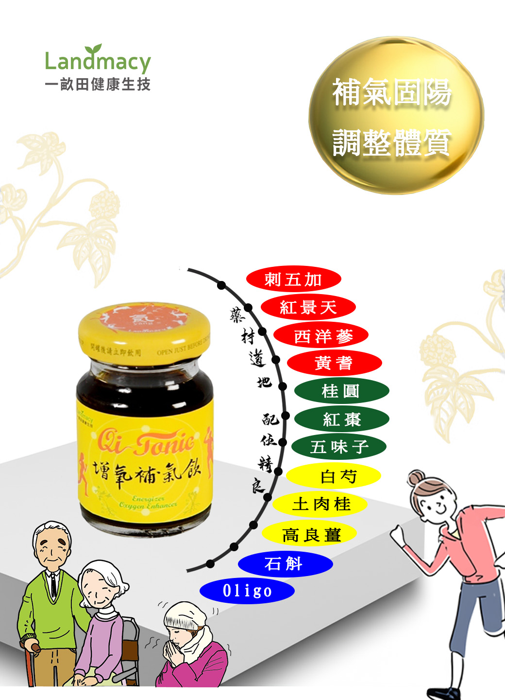內 容 物 : 水、異麥芽寡糖、桂圓、刺五加、紅棗、黃耆、余甘子、西洋蔘、五味子、紅 景天、土肉桂、 石斛、高良薑