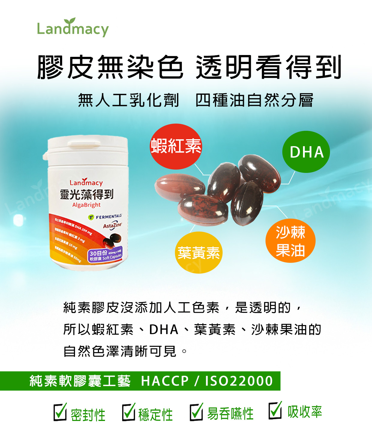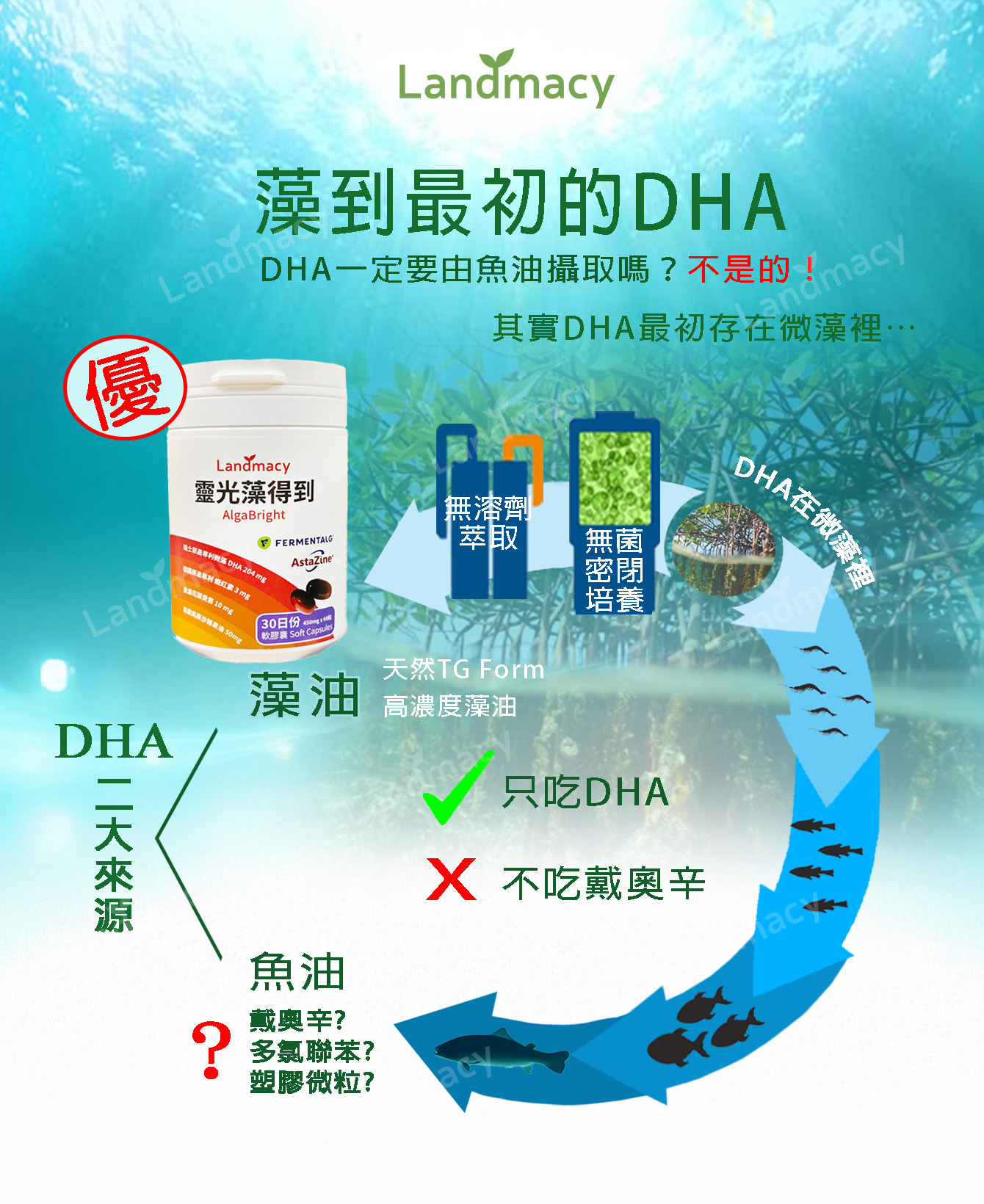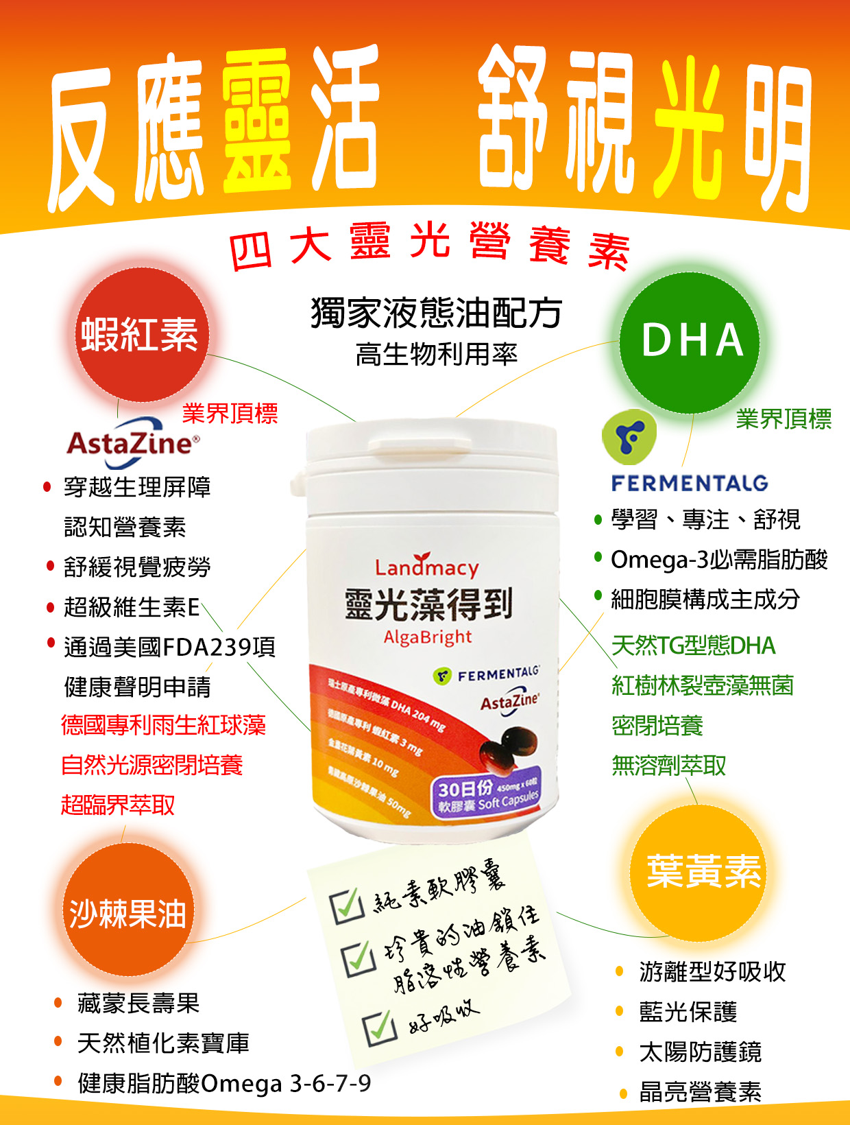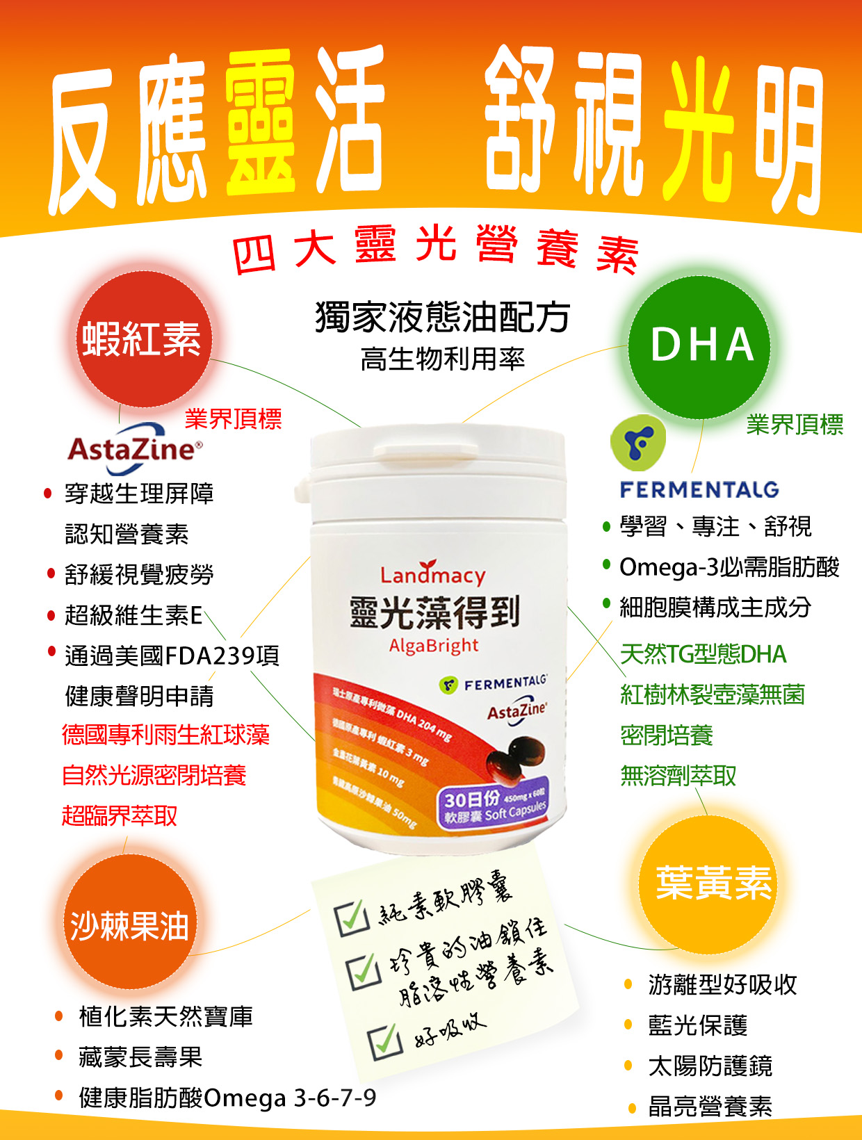 高濃度藻油(植物魚油DHA)、蝦紅素=藻紅素(具有穿越生理屏障的能耐,成功達陣,發揮強大的保健作用)